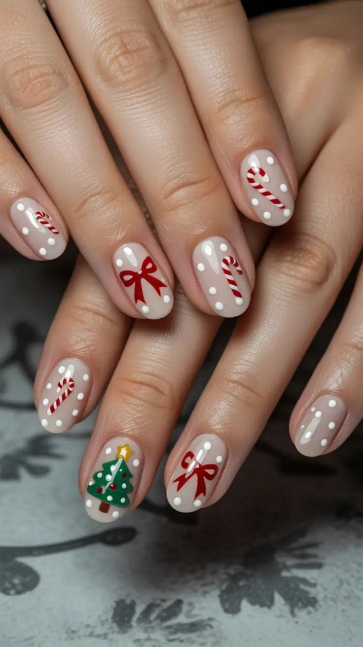 Com base neutra ou translúcida, adicione pequenas bolinhas em cores natalinas (vermelho, verde, dourado, prata) — uma referência às bolas de Natal e enfeites da árvore. Resultado alegre, delicado e versátil.