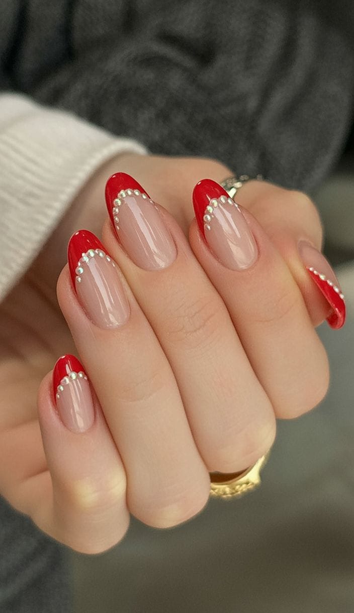 Combine a ponta vermelha com pequenos detalhes decorativos próximos à base — como folhinhas ou bolinhas verdes/vermelhas — remetendo aos visuais clássicos de Natal. É sofisticado e cheio de espírito natalino.