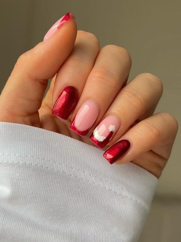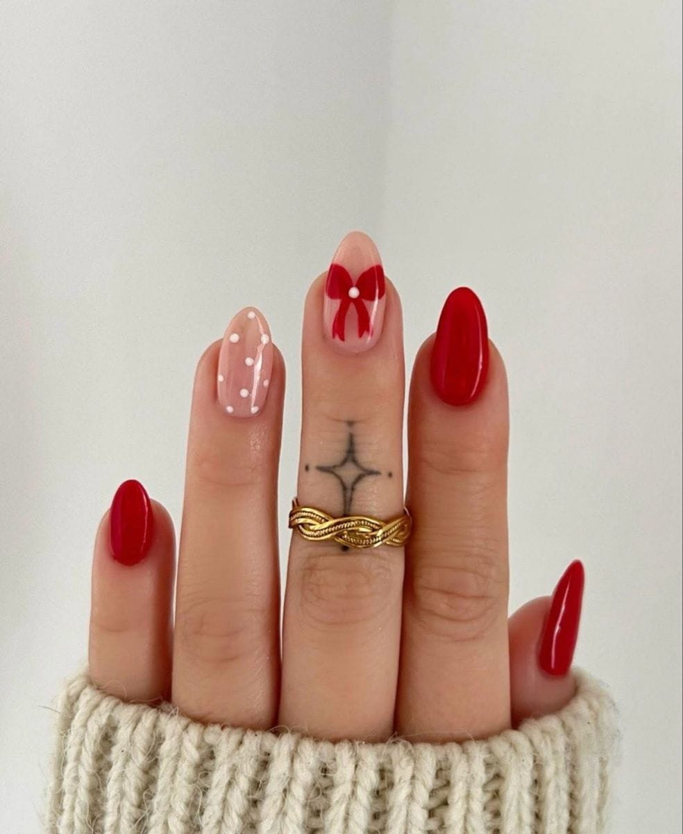 Escolha um acabamento com brilho (como prata ou metalizado) e desenhe pequenos laços vermelhos — lembrando presentes natalinos. Essa opção combina sofisticação e espírito festivo de forma delicada.