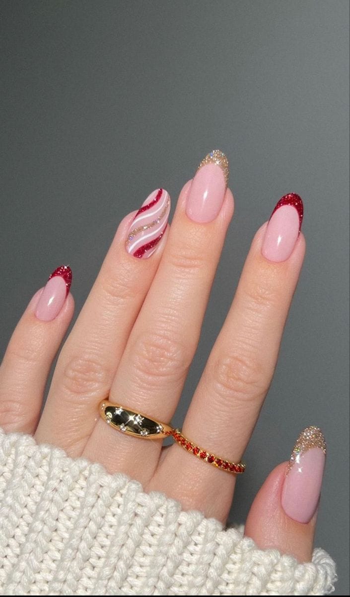 Se quer fugir do óbvio, aposte em traços abstratos: ondas ou formas livres usando tons natalinos como vermelho, dourado e branco, sobre base nude ou neutra. O resultado é elegante e contemporâneo.