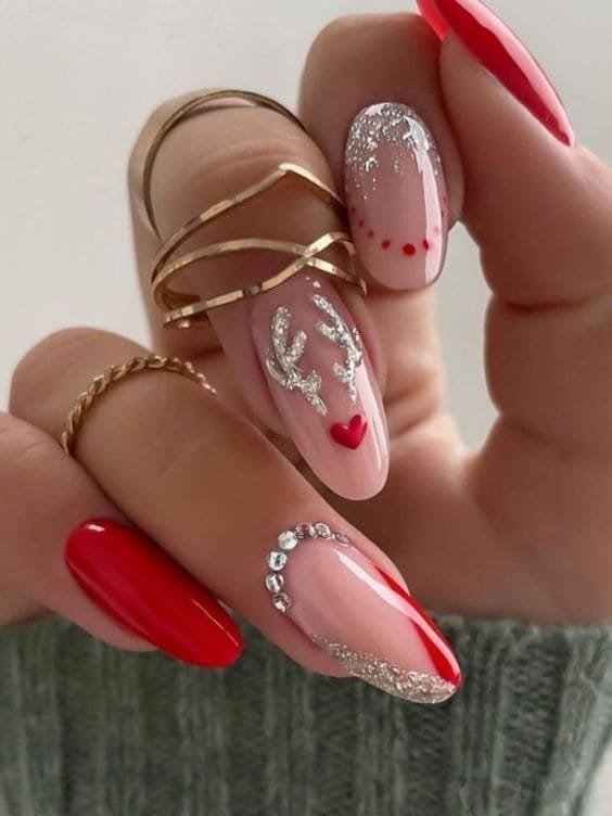 Perfeita para quem ama nail art criativa: use uma unha como “filha única” para desenhar a carinha (ou apenas os traços) de uma rena — nas demais, aposte em esmalte vermelho ou neutro. Charmosa e divertida!